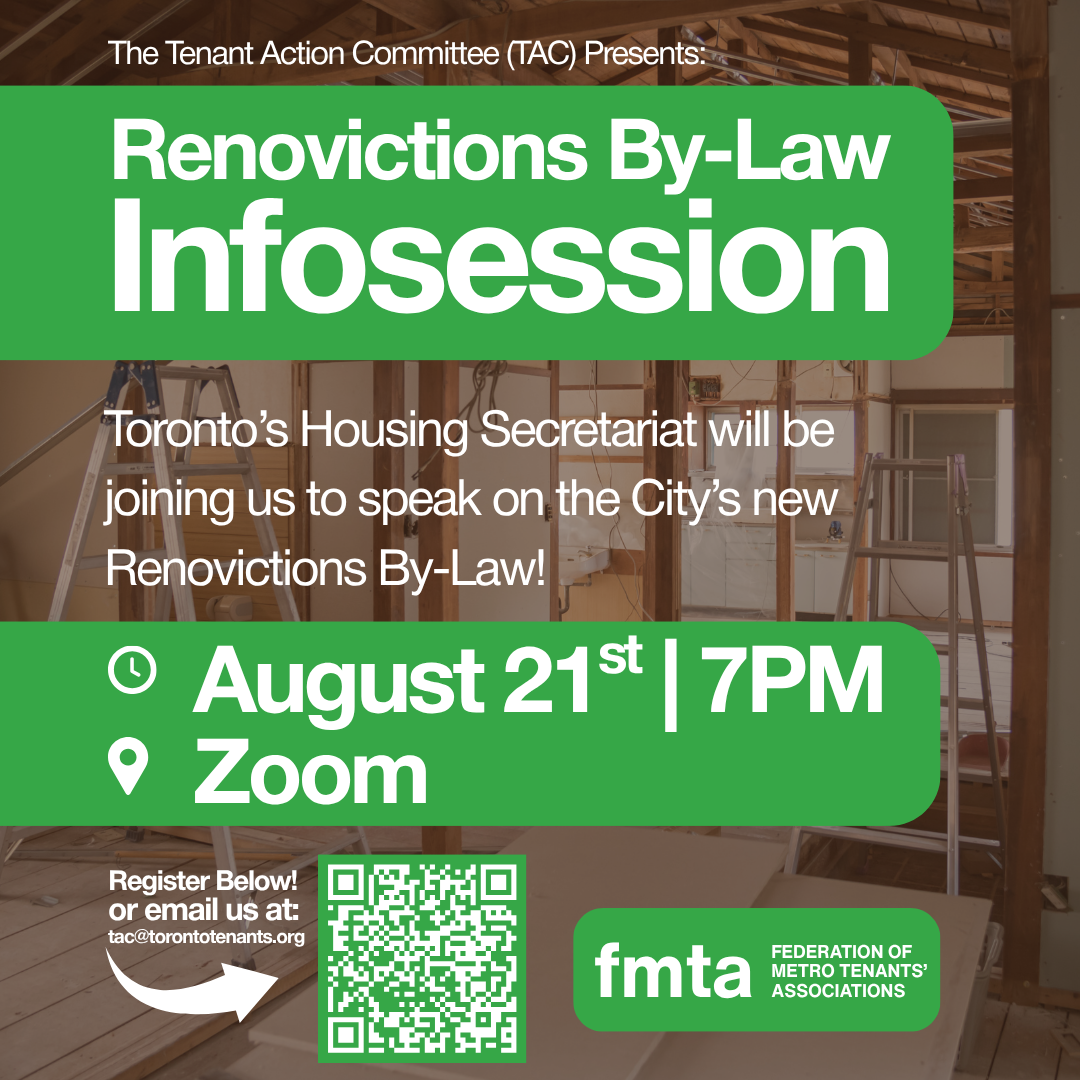 Join the Tenant Action Committee (TAC) and the Toronto Housing Secretariat for an infosession on your rights and legal responses when faced with a Renoviction.